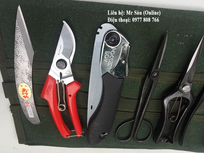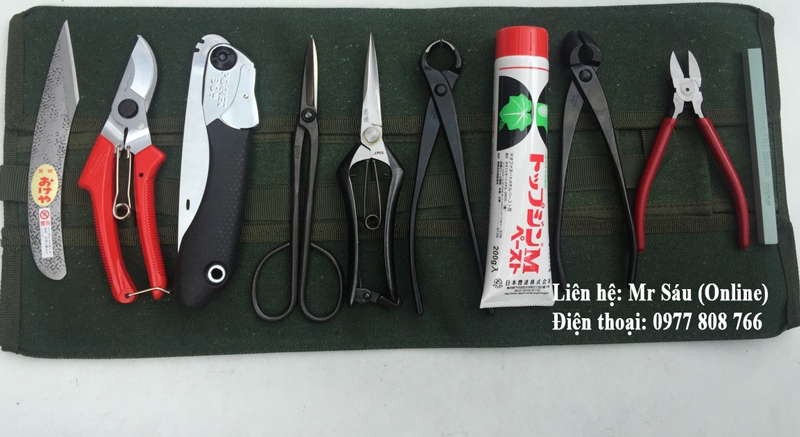 Gồm: Túi đựng, đá mài, kềm cạp tròn, kềm cạp xéo, kéo cắt cành, kéo tỉa chi cành, dao ghép cành, kéo tỉa, cưa xếp, keo liền da cây mới nhất, kềm cắt kẽm