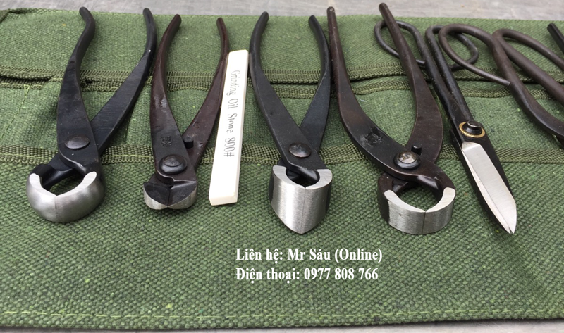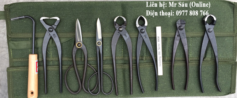 Bộ dụng cụ bao gồm: Móc rễ, kềm bổ tùng, 2 kéo tỉa, 2 kềm cạp tròn, 1 cạp xéo, đá mài, kềm cắt kẽm và túi đựng bộ dụng cụ